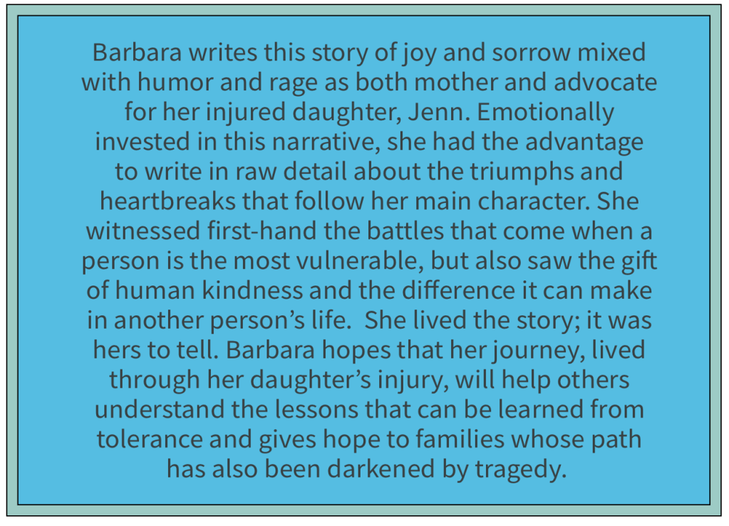 This book will help readers understand the complexities of recovering from a traumatic brain injury and the healing that comes with time, patience, and endurance. The author weaves her story around the unique caregiving required for her daughter who lacks any form of communication after her injury. Through laughter, tears, heartbreak and triumph, the author translates the lessons she learned into a narrative that touches the heart and deepens the respect for survivors of TBI and what they have to teach us. — Susan H. Connors, President/CEO, Brain Injury Association of America